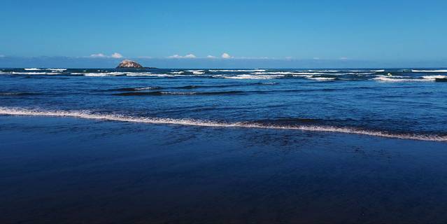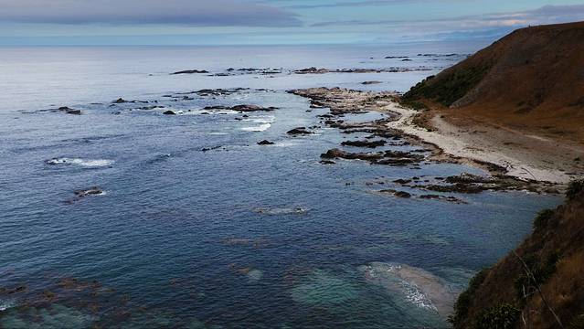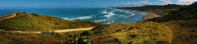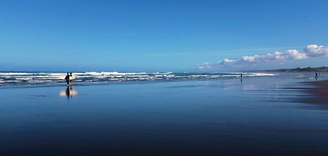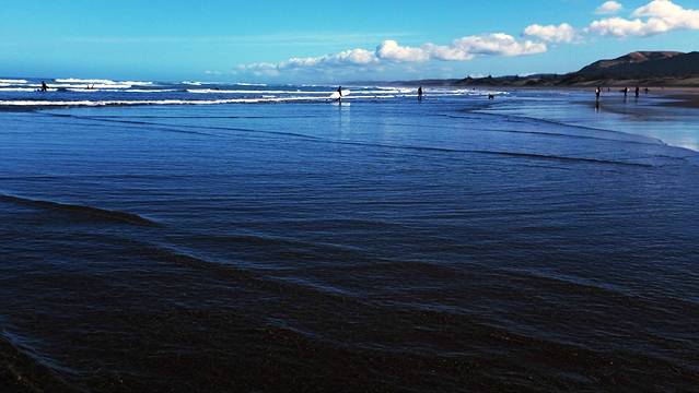 这一天我们去了距离奥克兰40公里的穆里怀海滩。海滩位于新西兰的西海岸,从奥克兰沿16号公路驱车1小时便可抵达。这里有数十公里黑色的沙滩,岸边岩石峻峭,是观海景,看海鸟,冲浪滑翔的好地方。
