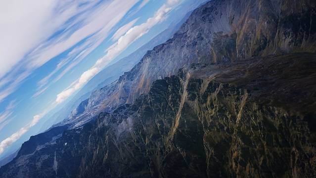 这里两岸耸立着数座2000米以上的山峰,山体银灰,在阳光的照印下散发着金属的光芒,山谷里是一大片金灿灿的草地和墨绿色的山毛榉林。
