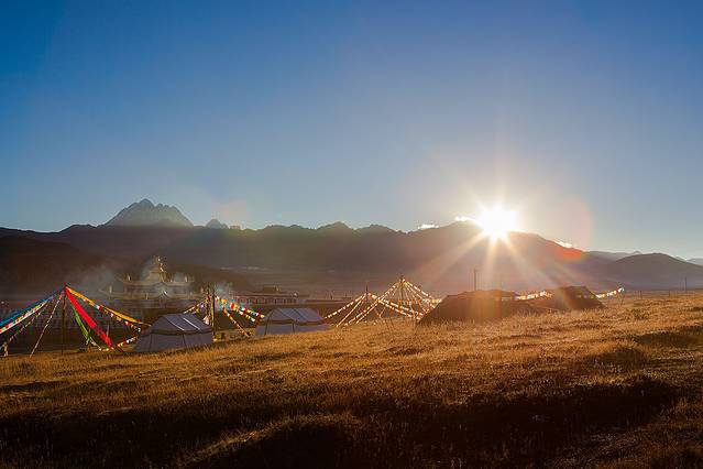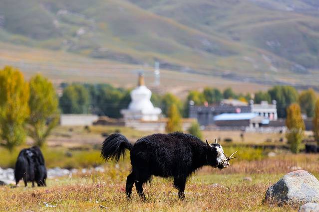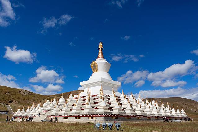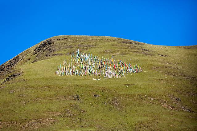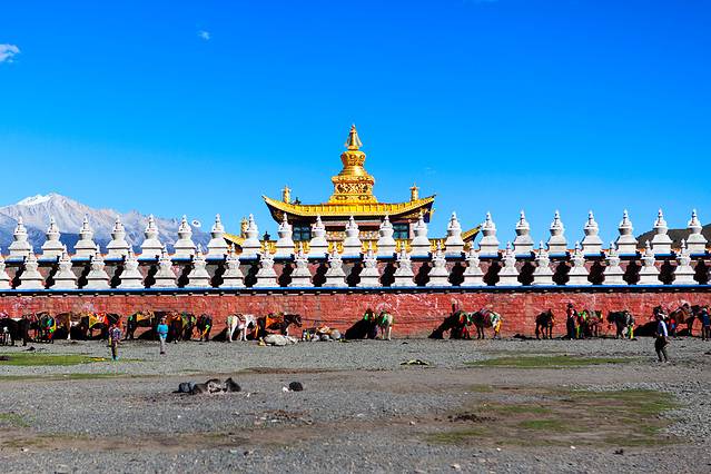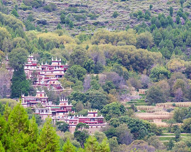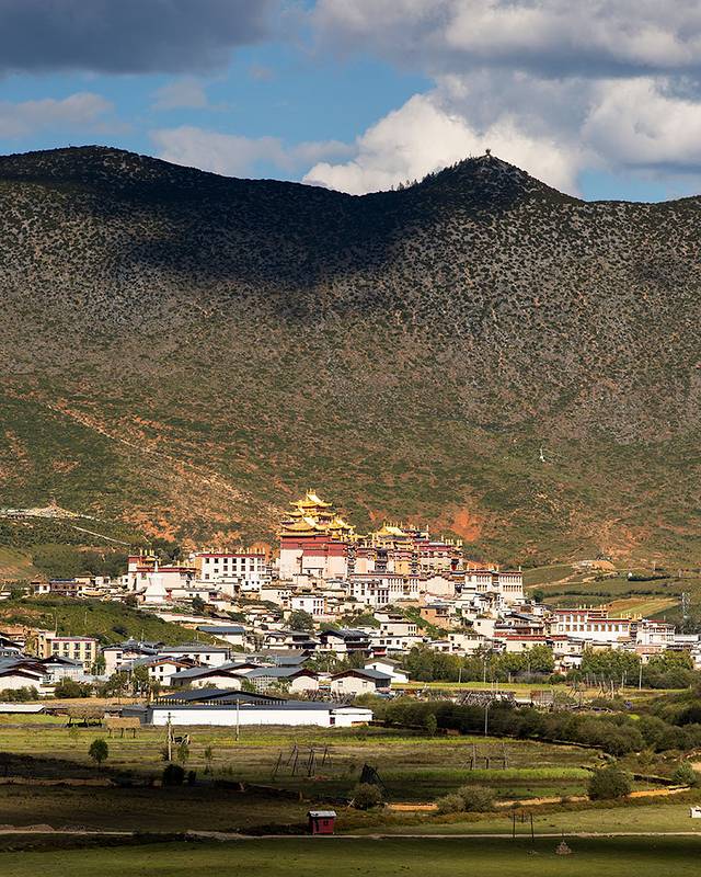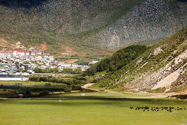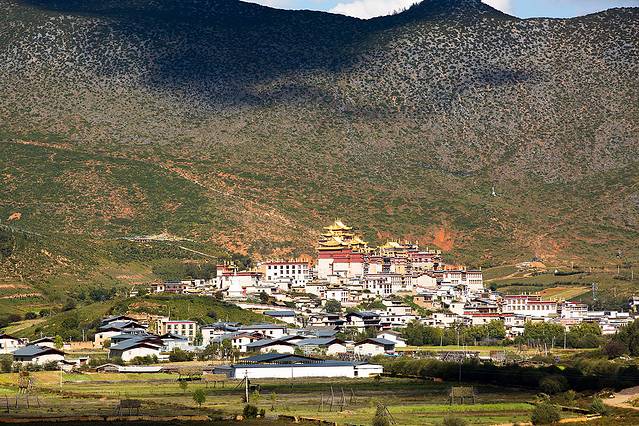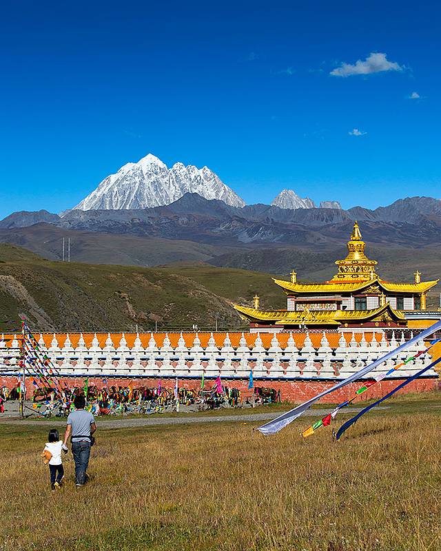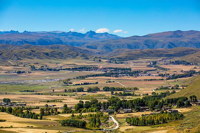 翻过山口,便进入塔公草原,远方的金顶是第十世喇嘛诞生地。