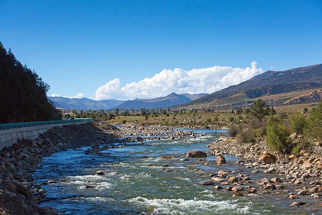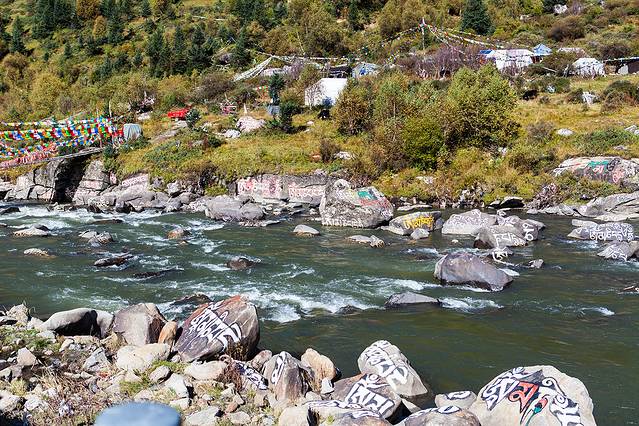 往新都桥,路边河流石头上全部刻着字,玛尼石。