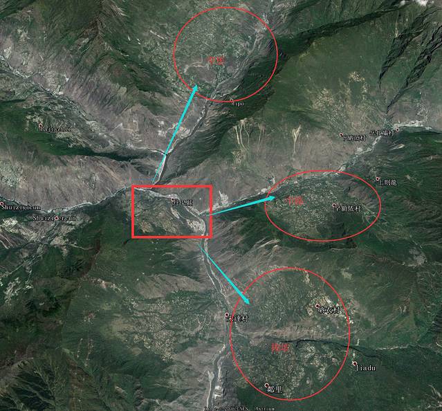 新都桥为摄影天堂,其实不是说镇上,而是如图所示蓝色地区的河谷地带,在早晚时候光线下照片非常出彩。