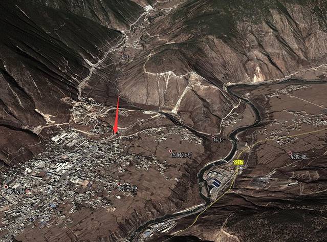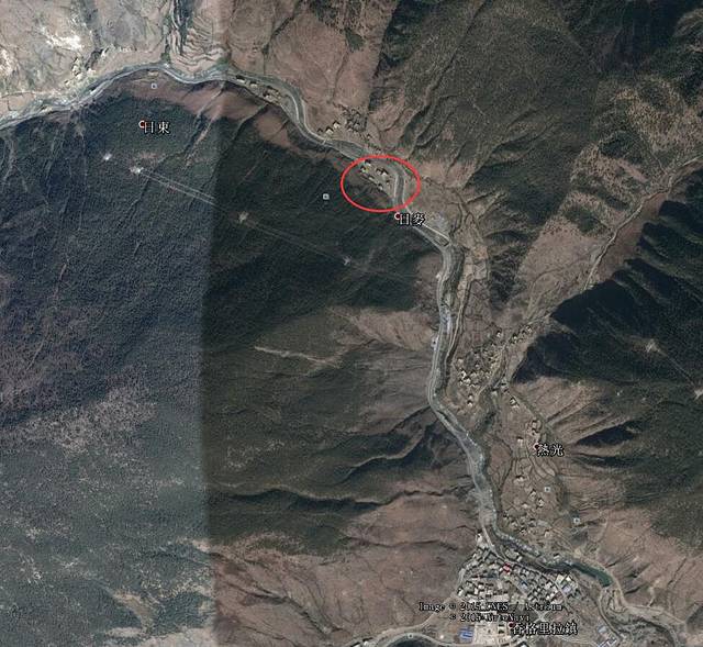 到香格里拉镇2公里路边,日麦村,下图标示所在位置。修轮胎店的旁边