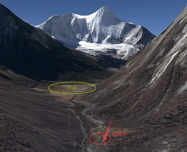 一般来说拍央迈勇雪山在牛场,但是牛场并不是最好拍摄点,因为前山把央迈勇的右肩挡住了,往下走一段路,在我标示的位置,水边这个点比较好。