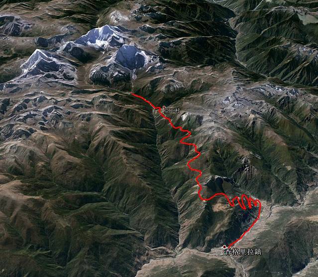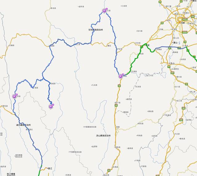 但是我所标识的两个圆圈路段都是塌方泥石流路段,十分不好走,建议不要走这条路,宁愿走318经过巴塘、芒康、德钦去香格里拉(特别是轿车)。
