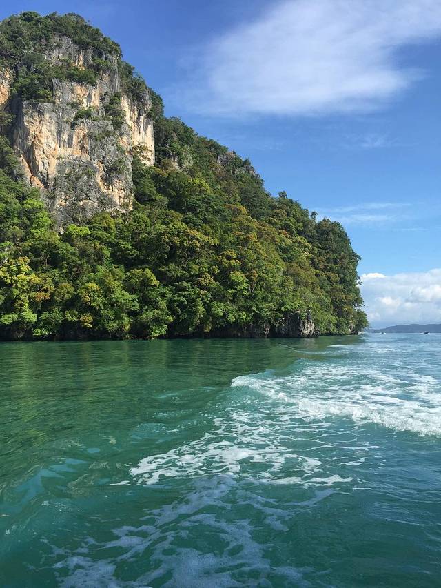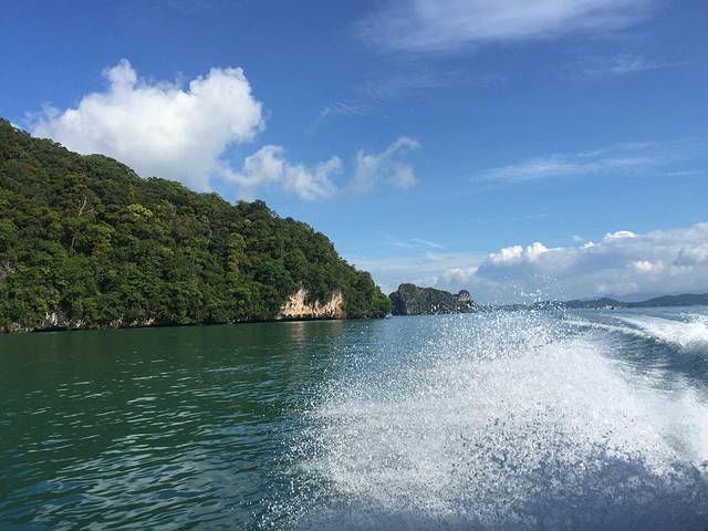 游艇激起的浪花和翠绿的小山~
