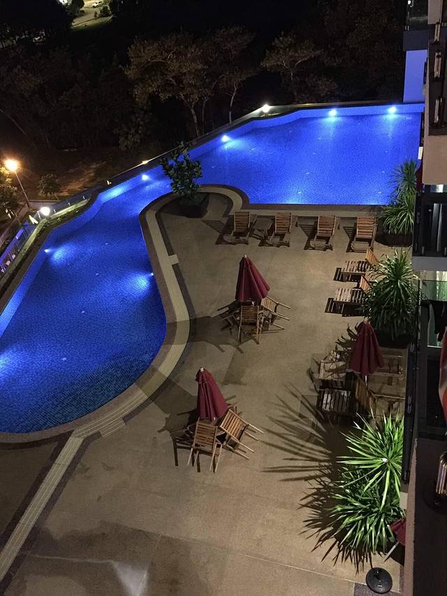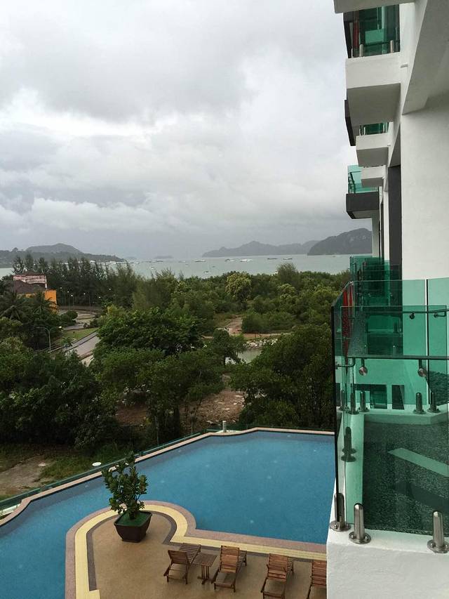 从阳台看下去的泳池,可惜没游成。第一天早起跳岛游,第二天下雨。