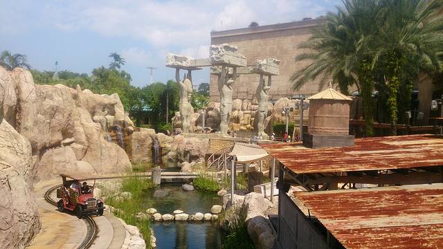 这个项目比较弱,名叫《寻宝奇兵》(就是比起过山车那种,没那么刺激的),开着吉普车在园区里一通转悠。为了节约时间,我没排队。