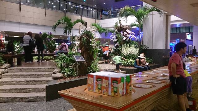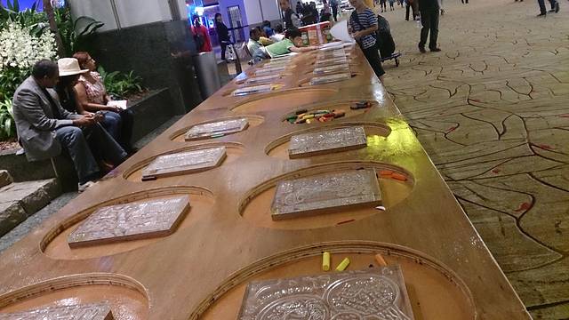 T2里的兰花园,旁边是拓画的区域,免费的白纸和蜡笔,可以让大家把各种新加坡特色图案拓印下来,留作纪念。大姐看到纸笔就走不动道儿,在那里玩了好久。