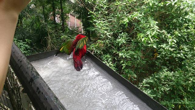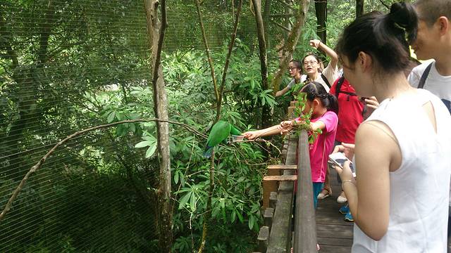 因为买的票就是门票+游览车的套票,所以有车就坐呗。游览车的好处就是节省体力,不过它只走大路,很多小路里有不少飞禽是看不到的,而且能看到大路的飞禽,也只是匆匆路过扫一眼。所以我们从门口第一站上车后,在第二站就下车了,那里好像叫彩鹦谷还是什么的。进门的地方是买吃食和纪念品的,我没仔细看。进到里面去,各种鹦鹉大大小小花花绿绿,都不怕人,都等着人喂呢。游客手里的塑料小碗是买来的,里面的食物鹦鹉们好像很喜欢。在我看来,好像就是粥汤一样的半透明液体,也不知道他们为什么那么爱吃。估计是甜的,因为放置空盒的收集地方,吸引了不少小蜜蜂。