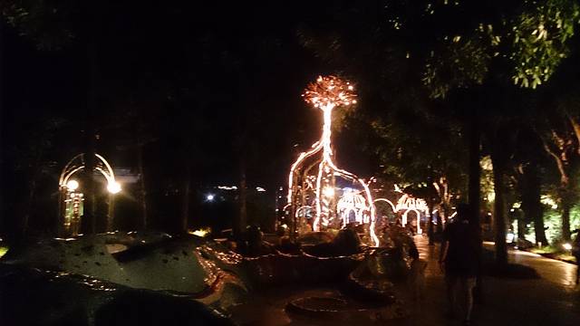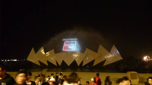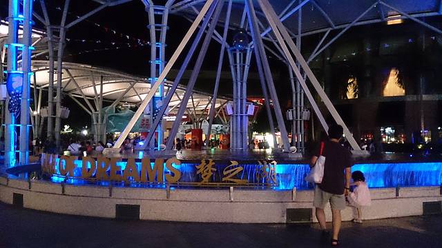 鱼尾狮后面的五彩池子,只是晚上看光线昏暗,没那么靓丽了,好在有灯光。