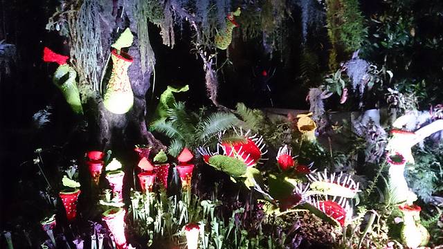 园里造型各异的植物,分布在各种好听名字的小园里。趁着天还没黑,在园里慢悠悠逛逛。今晚的夜景就是欣赏《花园狂想曲》,虽然之前在摩天轮上远观过发光的超级树,可我还是很期待这个表演的。因为7:45、8:45各有一场,考虑到孩子小,想尽早回去休息,所以计划是看7:45。时间尚早,去冷室看看。