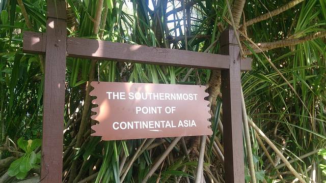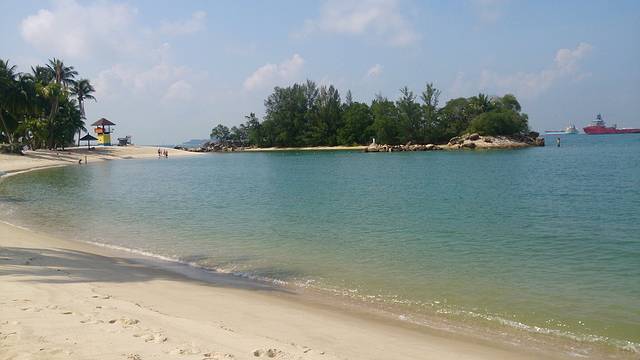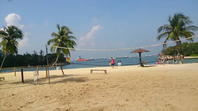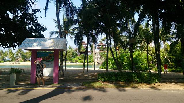 之前看圣淘沙的地图,就看到过什么“亚洲大陆最南点”的景点,想着没什么事,去看看吧。我们住的酒店的位置是在西罗索海滩,那个最南点是在另外一个海滩(palawar beach)。坐小火车可以直接到。一早吃过早饭,在酒店门口等小火车。上车时候看到车上已经不少人了,还有提着行李的,估计是一早退房出岛的。在捷运站,大家呼啦一下都下车了,只有我们三人在车上,司机确认我们是要继续前行到另外那个海滩去以后,就继续开车了。三五分钟的功夫就到了。下车,周围没人。往海边走去,才发现三三两两在海滩上晒太阳或者游泳的人。