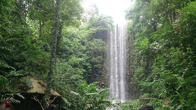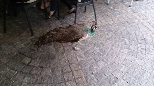 在小瀑布附近有个买零食和快餐的地方,碰到一只悠闲溜达的孔雀,穿梭在餐桌餐椅和人群间,大概是在寻找吃食。我正感叹,啊!孔雀耶!并且不知道该如何继续表达自己觉得很神奇的想法的时候,朋友忽然冒出一句:这是拿孔雀当鸡养嘛。我听了,瞬间觉得没那么高大上了,而且她说的真是好有道理,太贴切了