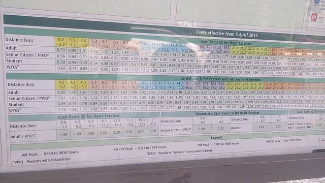 来到车站,先学习一下怎么看车牌、查查车票需要准备多少零钱。因为我一直在犹豫要不要买EZ Link卡,那卡的5坡费用相当于是工本费,退卡时候也不能退还。虽然买票时候会有一定折扣,但是我也不确定能把那5坡赚回来。而且昨天赶上国庆公共交通免费,所以我就抠门了,一直没买卡。