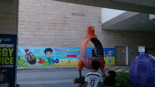 还是在酒店门口坐小火车到捷运站。下了小火车,羊同学就往捷运站走,我赶忙跑着去给这几天经常路过的花花绿绿的卡通形象照了相,算是留作纪念吧。照片里的背景,墙上箭头的方向就是我们住的酒店的方向,西罗索siloso