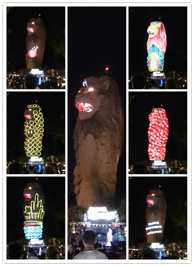 然后继续再走,就溜达到了大鱼尾狮,彩色的灯光打在上面,配合着音乐,天黑后凉爽了很多,酒足饭饱后观赏,舒服啊~~~然后继续前行。