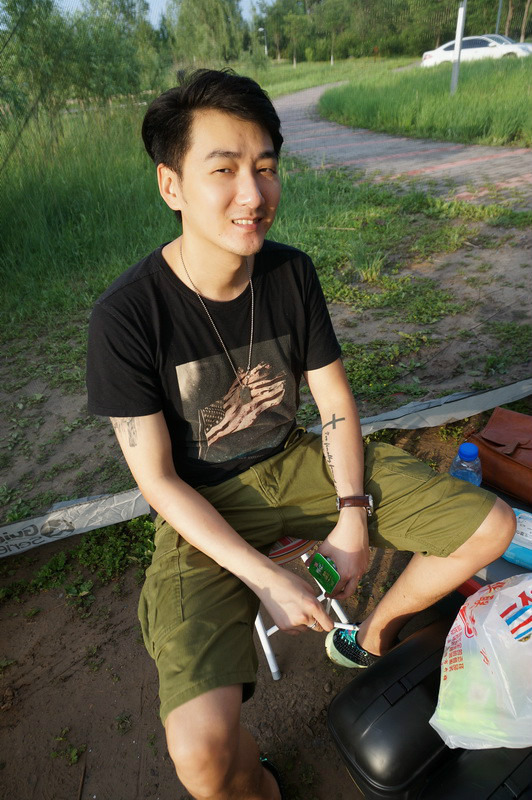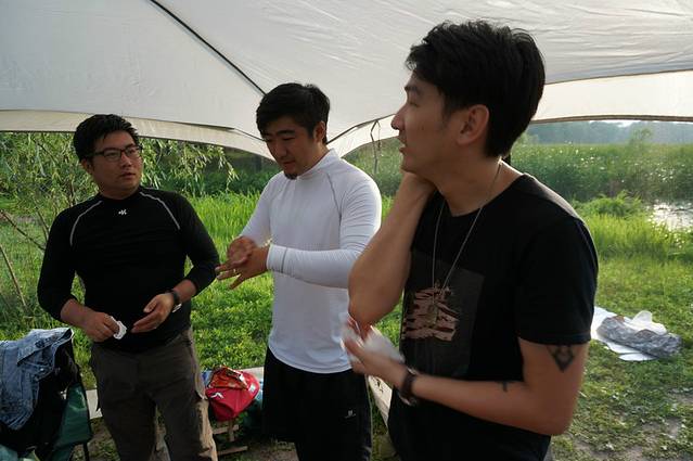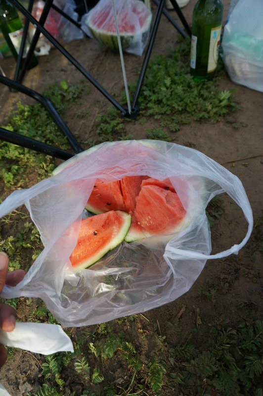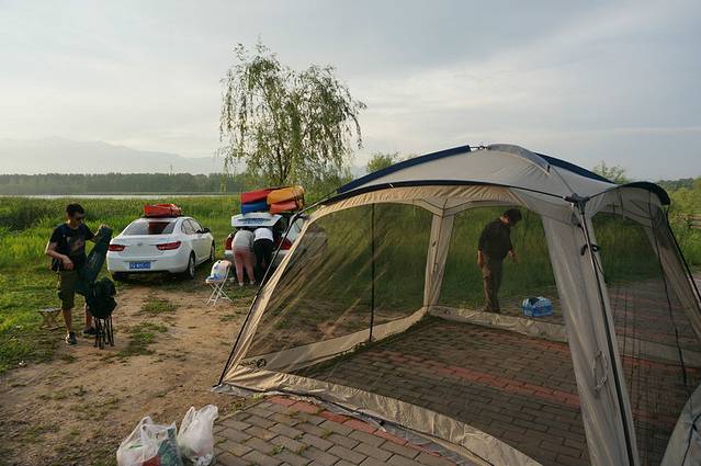 早已到这里多时的邓童鞋、其夫人和萨木君,以及意凯的夫人,早已在此小酌久矣~~~在全是纱幕的帐篷里,我们说着笑着,四周新鲜的空气,不断的涌进来,“屋里”的空气常换常新~!品着这边独有的,一场的燕京啤酒,那种愉悦的身心上的放松,和冰爽的体验,溢于言表。。。吃着意凯他们早已准备好的小凉菜,我们谈笑在风中~