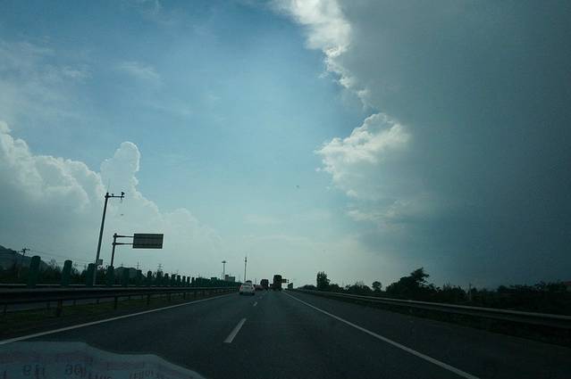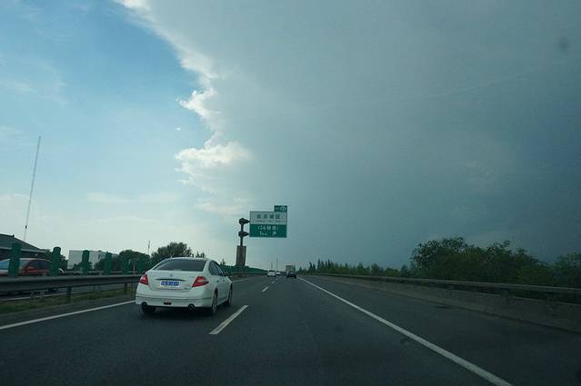 黑云压境,我们最终还是没有逃脱被雨水洗礼的命运,庆幸的是雨并不大,走走停停,淅淅沥沥。出高速以后,我们决定找路边停下来,休息片刻再赶行程。可以看到现在的天空的云彩已经快聚合到一起了。那壮观的天象,还是森森的吸引力我和骁仔驻足了好久。