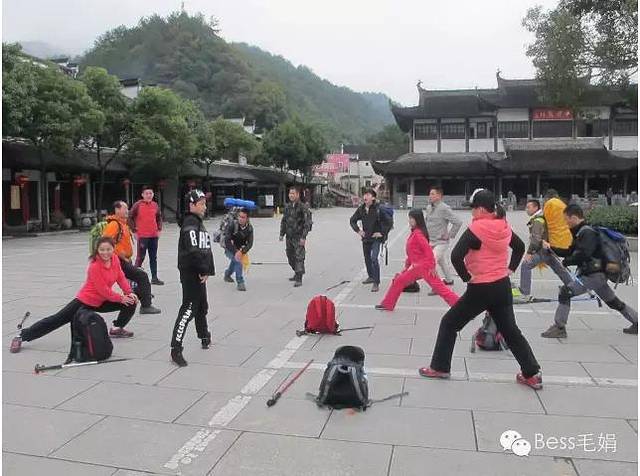 2015年11月13日晚8点我们一行13个人从上海出发,一路高速。路上队长金刚给我们介绍了本次活动的路线安排。随行的朋友大多都是第一次见面,并不认识,于是开始自我介绍,说下户外花名,没有的当场取一个。随行的大多是80后90初的小伙伴,这次很荣幸,哈哈姐、老俞、还有康明哥,算是我们的长辈,此次也和我们一路同行。完全看不出,要不是自我介绍。所以说,喜欢玩户外的人感觉就是青春活力,完全看不出年龄的。路上大家各种闲聊瞎侃,发发微信红包,气氛很是火热,大家由最初的陌生害羞到各种逗逼。由于在杭州绕城高速有一段在修路,车都停着在等,我们差不多到凌晨2点左右到达了绩溪的龙川景区的停车场这里。领队征求大家意见,部分人在车上睡觉,部分人扎营在景区旁边的走廊。早上不到6点多,大家起来收拾东西,然后去景区旁边的农家吃点早餐。7点半照了一张全家福,接着领队让大家开始进行登山前的热身运动。在老俞的带领下,大家有模有样的开始蹬腿扭脖跳跃。