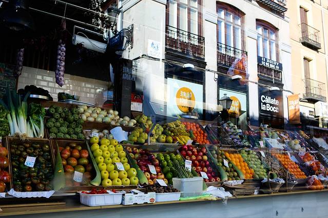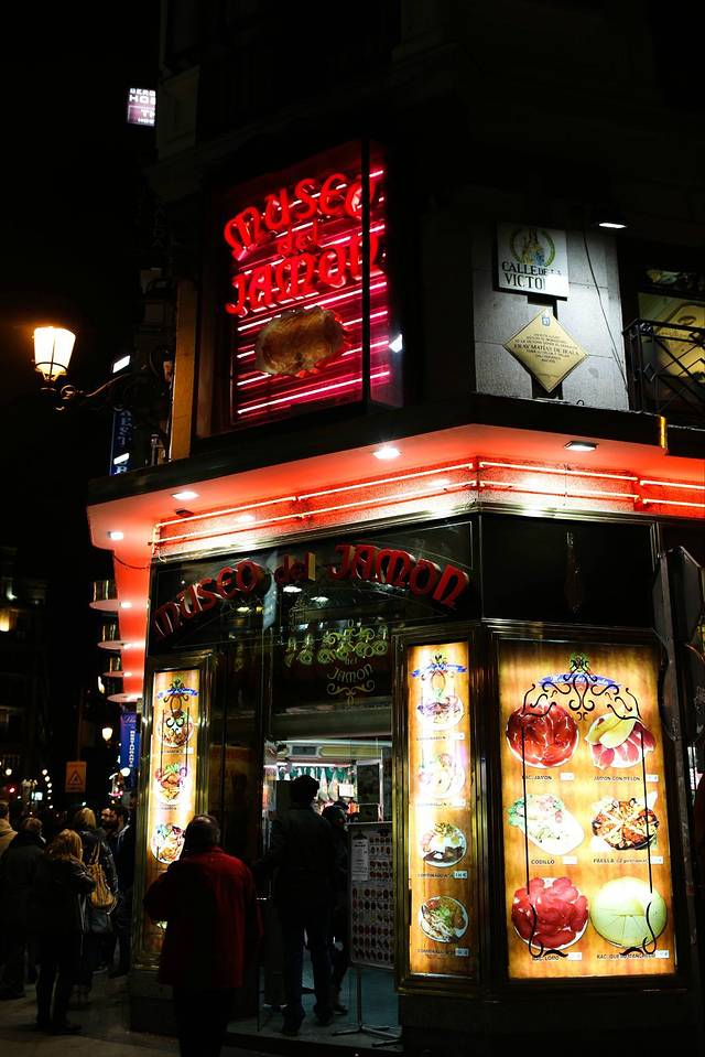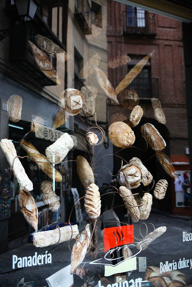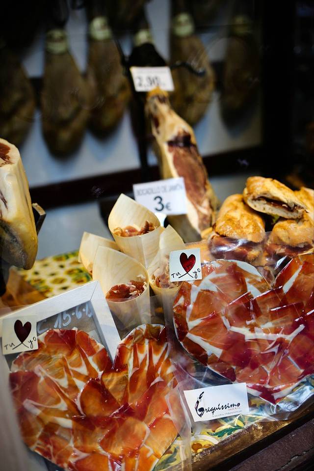 在古城里一边转悠一边聊天,把古城的边缘一带看完,又回到了中心的商业街区,看见了Summer最爱的西班牙熏肉jamón,由于是情人节前后的关系,这家店还把熏肉排列成爱心的形状……