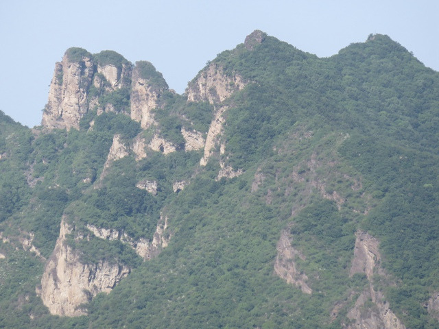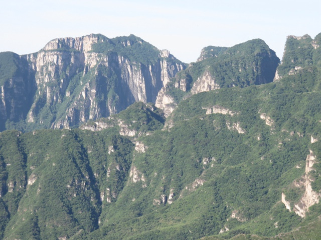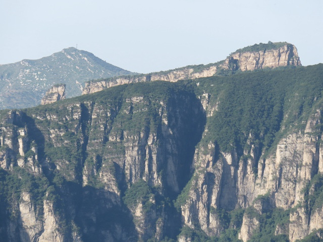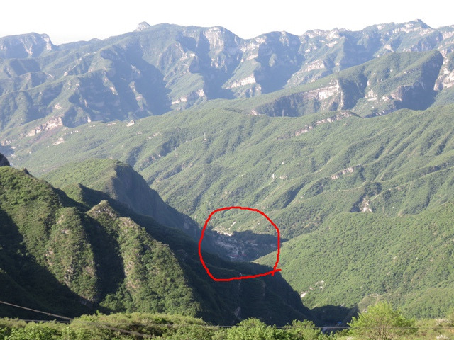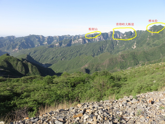 从这里远眺以前攀登过的棺材山和青锋岭大断崖。。(图中标记是下三图长焦特写处)