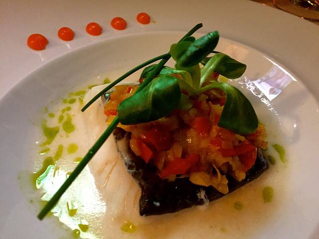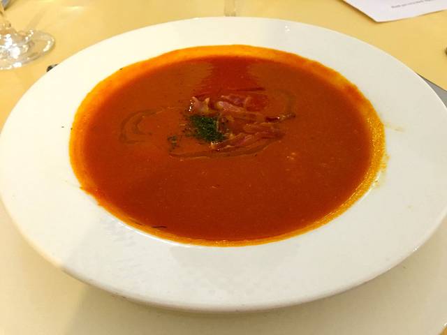 前菜是蔬菜泥和西班牙特色的炒面包干,主菜是三文鱼和牛肉