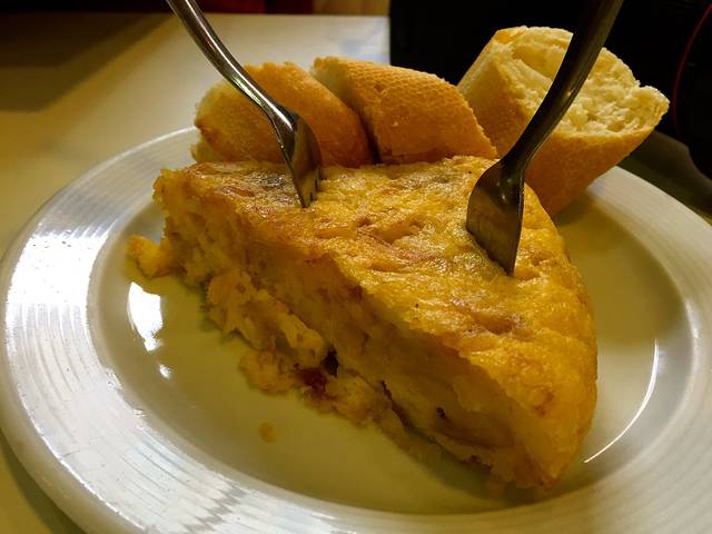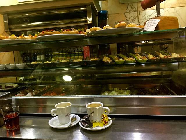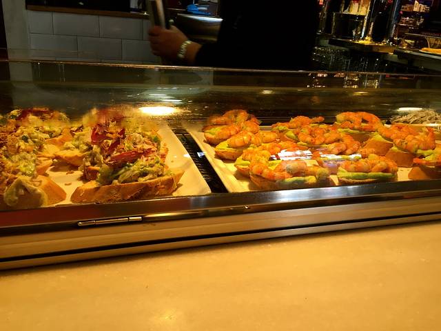 但是——我们还是没办法吃上晚饭,因为正经餐厅依然没有开门,最后,在街边找了一家tapas店。胖子一直抵触这种面包上加块肉或者奶酪的小吃,两趟来西班牙一次都没有吃过,没想到居然出乎意料的好吃,而且相当便宜,一份几毛钱而已,临走的时候还蹭了块赠品(最后一张)