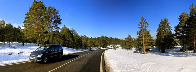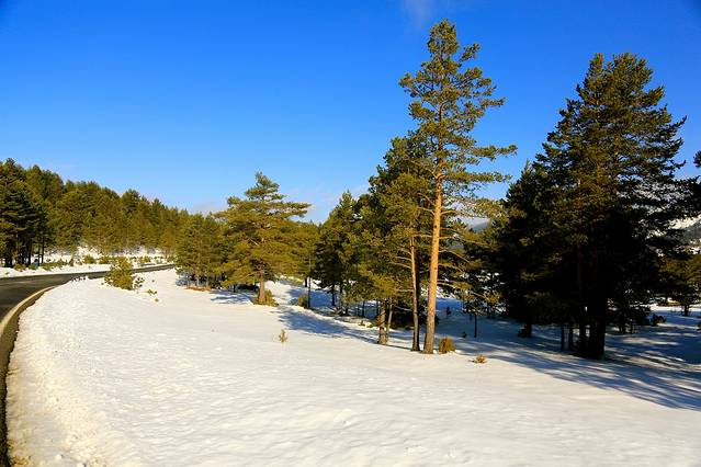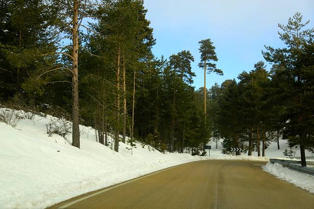 然后,天完全放晴!那种从迷雾中一步步走出来的感觉太棒了,路边尚未融化的积雪也很棒,在阳光下反射着晶莹剔透的光芒,勾引的我们在西班牙唯一一次违反了交通规则——在路边停了好一会的车,下去玩雪