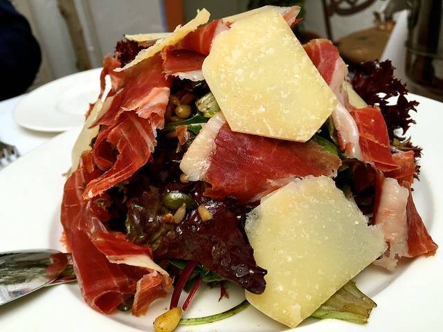 点了加泰罗尼亚特色的红白沙拉、火腿沙拉、炖牛骨和招牌海鲜饭,说起海鲜饭,我可真所谓贼心不死,因为7年前到西班牙的第一顿吃的就是海鲜饭,所以这次的最后一顿明知道必须是夹生饭还哭着喊着要点 ,no zuo no dia的典型。