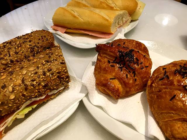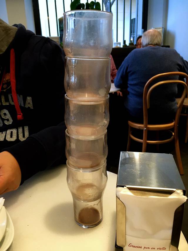 巴塞街头很多这种小店,卖咖啡热巧克力各种简单甜点和三明治,如果要求仅为裹腹,这里是价廉物美的不二选择。坐下来才发现自己不仅饿坏还渴坏了,两个人你一杯我一杯一共喝了5杯热巧克力,搭了个杯子塔,看得旁边看报纸噶三湖的西班牙老头老太们直乐呵。