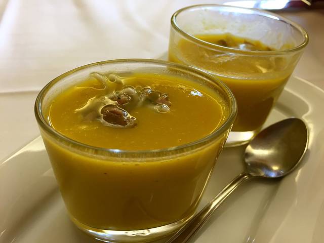 前菜分别是海鲜饭和不知名海鲜汤,当然还有西班牙必不可少的佐餐面包,主菜是煎猪排和炖羊肉,还有甜点可以选择冰淇淋或者水果。
