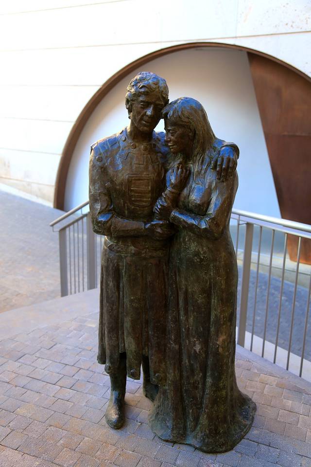 阿曼德斯博物馆应该算是特鲁埃尔最著名的“景点”了,它源于一个著名的悲剧爱情故事“特鲁埃尔恋人”——一个白富美爱上了一个老矬穷,白富美的父亲棒打鸳鸯,老矬穷决定雄起,寻找出人头地的路,临行前,他说服了百般不情愿的老丈人(当然是愿望中的老丈人),让他同意多养女儿5年,结果5年时间一到,老丈人就迫不及待把女儿另嫁他人,当老矬穷成功变身高帅富回乡的时候,他心碎的发现害怕的事情已经成为事实,于是高帅富只能找到白富美,祈求她的一个吻,白富美出于对婚姻的忠贞拒绝了这个吻,最终高帅富心碎而亡,而白富美在穿着丧服出席了葬礼并给了他一个吻之后,没多久也死去了……