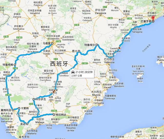 我的最终行程是这样确定的,2.4和2.15正好马德里和巴塞罗那分别有主场比赛,就选择了2.3马德里进,2.16巴塞罗那出,整个行程顺着从马德里到巴塞罗那的逆时针,以安达卢西亚为主,辅以卡塞雷斯的小镇瓜达卢佩和特鲁希略,巴达霍斯的古罗马城梅里达,卡斯蒂利亚-拉曼恰的山城昆卡以及阿拉贡的特鲁埃尔,其他的热门目的地譬如托雷多、塞戈维亚、阿维拉,因为08年已经去过,所以放弃,譬如巴伦西亚或者马拉加的海边小镇或者几个离岛,因为考虑到是冬天,所以也放弃,北部地区因为时间明显不够当然也只能放弃。其中除了看球的两天,另外分别在比较大的城市塞维利亚和格拉纳达多停留一天,其他小镇都是一晚即走或者当天路过,除了科尔多瓦到昆卡以及特鲁埃尔到巴塞罗那,每天开车时间尽量不超过3小时,当然自诩上辈子是赛车手的胖子也不会跟我计较开车时间的问题,哈哈。