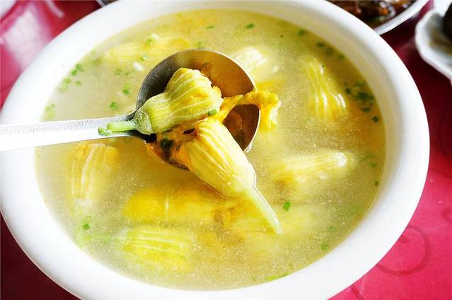 南瓜花蕾汤,不要以为就是这么简简单单的花,其实花里内有乾坤,咬一口下去,竟然有以豆腐为主料的馅,真是内外兼修的好菜。