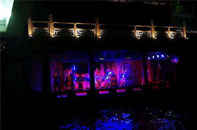 屋檐下一群靓丽青春的美女给我们演奏乐曲,据说她们用的都是水晶打造的乐器,在夜晚更显灵动和绚丽。