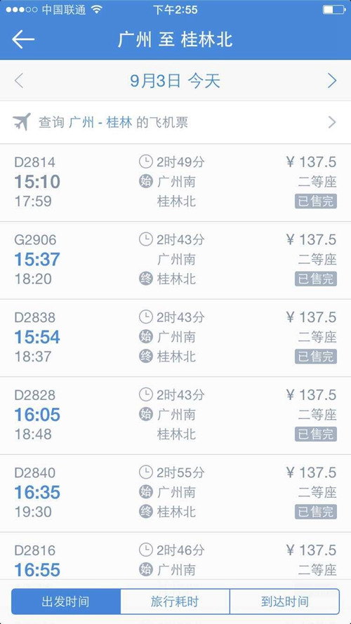 两广高铁通车后,从广州去桂林很方便,一天有十几趟车可乘,时长2时40分钟左右,二等车票价格137.5元,下图是用手机软件看到的售票情况,当日票已全部售完,因此必须提醒大家要提前1-2周就开始买票。