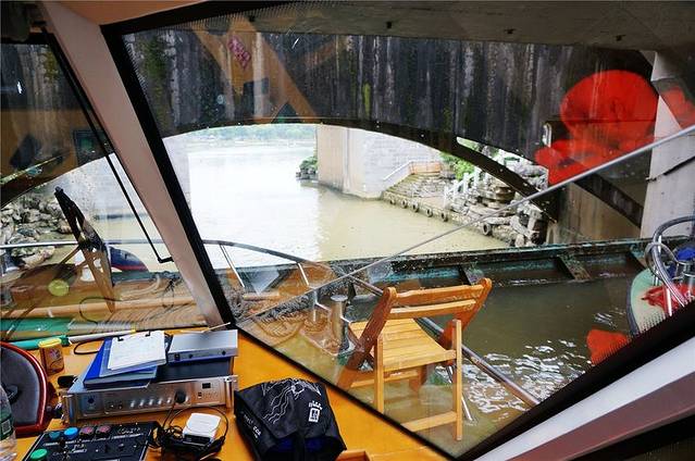 游船到达一河道处,此处前后水高落差3米,此刻我们将随同船体坐一次水中电梯,工作人员将船停靠在闸道处,慢慢放水降低水位,然后打开闸道船体随水流冲出,这样的体验还真是有趣。