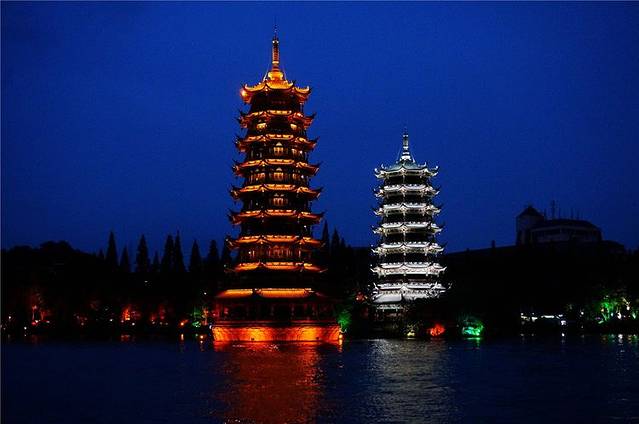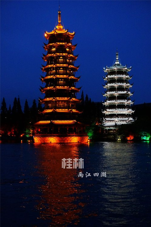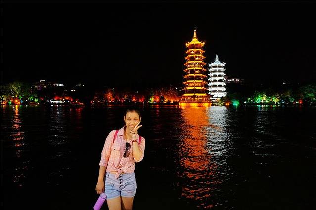 观看完饭店的大瀑布表演,我们在码头集合乘小船夜游两江四湖。一到码头就可以看见桂林的地标性建筑物——日月双塔。金黄色的那座叫日塔,铜质建造的,银色的那座叫月塔,琉璃建造,夜晚看两塔金银闪烁,璀璨万分。