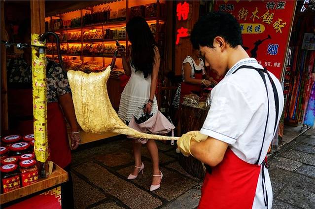 买姜糖的作坊,老板一边制作一边售卖。