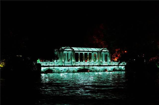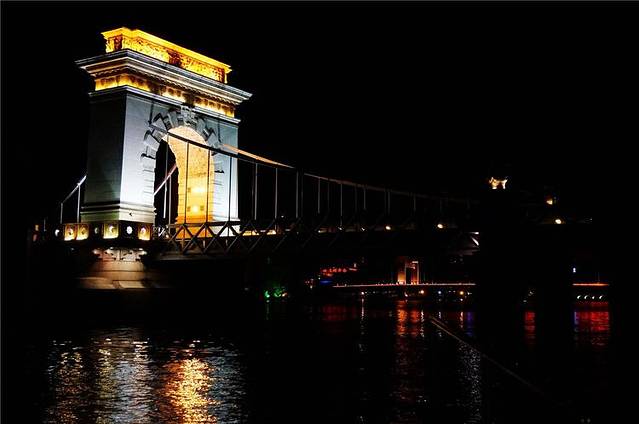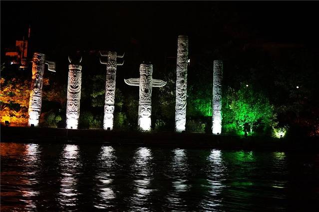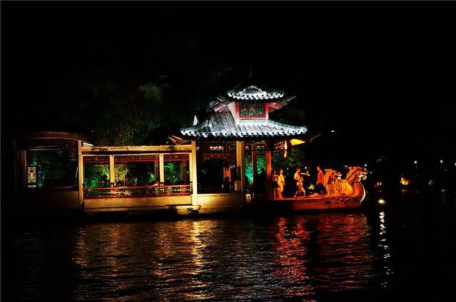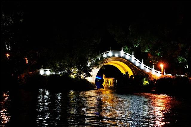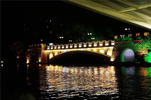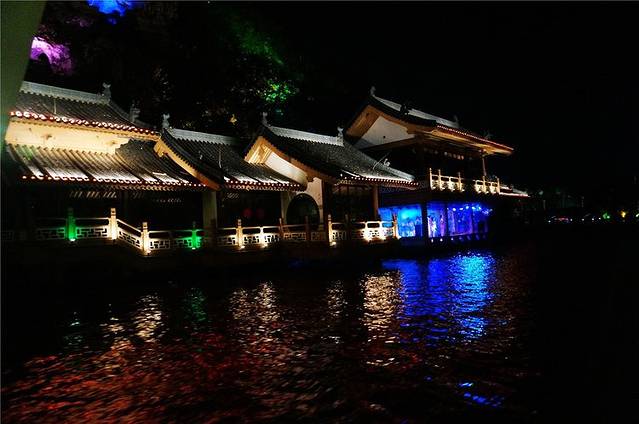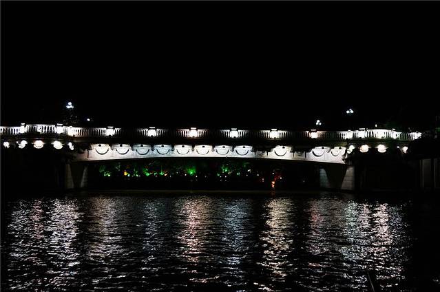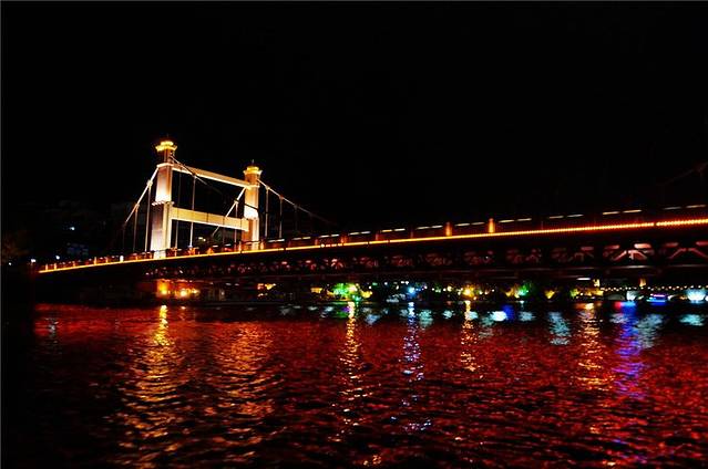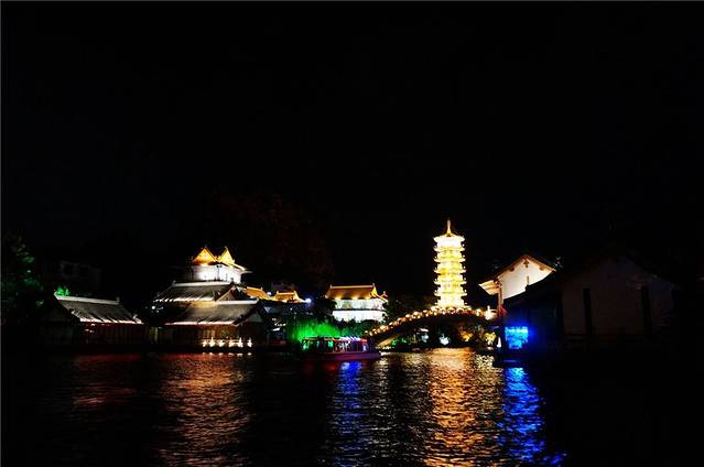 傍晚岸边的塔、亭、桥都被披上各色灯光,水中倒影加上缓缓流水,放眼望去河面上玲珑剔透,奇光异彩。