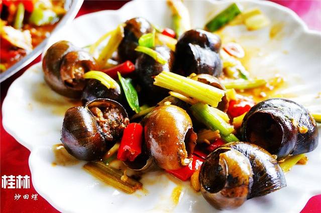 桂林人爱吃螺,本地产的螺特点是大个肉肥、味道鲜美,买回来的螺放在清水中养几天,让螺蛳把肚里的泥巴及排泄物吐掉,再用刷子清洗干净,敲掉螺尾,用油、盐、姜、三花酒、辣椒,大火爆炒,最后放入紫苏叶、高汤,加水炯煮,于是清香鲜辣的炒螺便做成了。