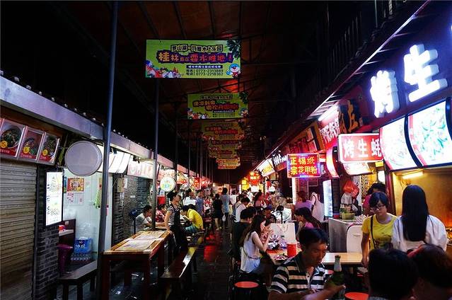 吃完晚饭后,我们开始逛步行街里的“尚水美食街”,里面特色美食应有尽有,巷子里充满了烧烤味,麻辣味,鲜香味…….人一走进去,就不想出来了,食客们也非常多,几乎每家门店前面都坐着吃饭的人。