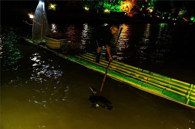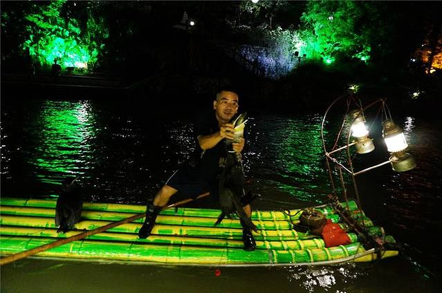位于桂湖丽泽桥与观漪桥之间的那段水路上,闪耀着星星点点的灯火,游近一看,一艘艘竹筏漂浮在水面上,捕鱼人和鸬鹚正在上面忙碌。