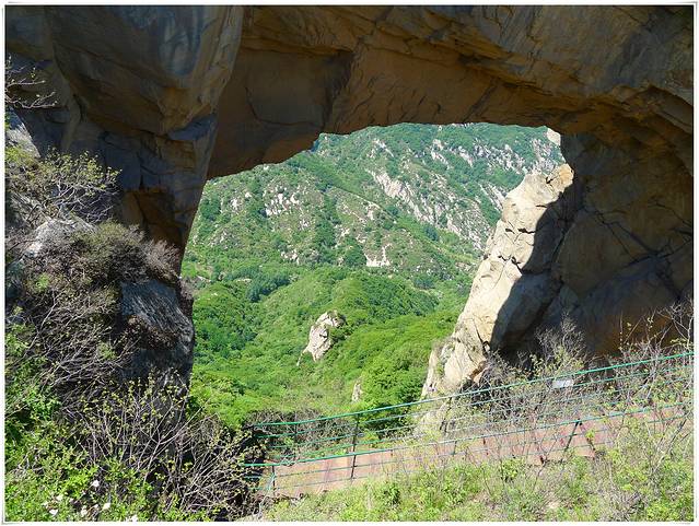 这就是著名景观“扁担眼”了,也称“天门洞”,顺着栈道下去就是天门山景区了。