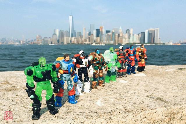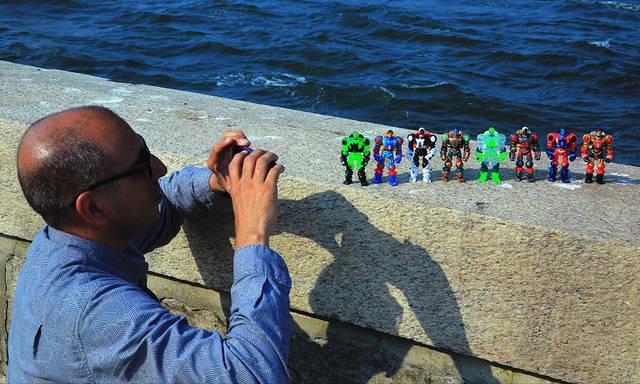 秃顶大叔带着自己组装的心爱玩具来拍到此一游。
