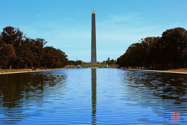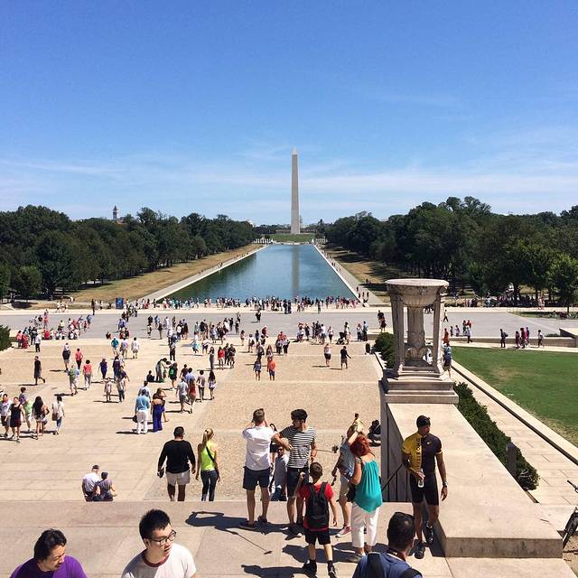 站在林肯纪念堂的台阶上拍华盛顿纪念碑及人群。
