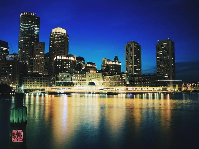 晚上去拍波士顿的夜景。有灯,有水,有船,有倒影,好美~