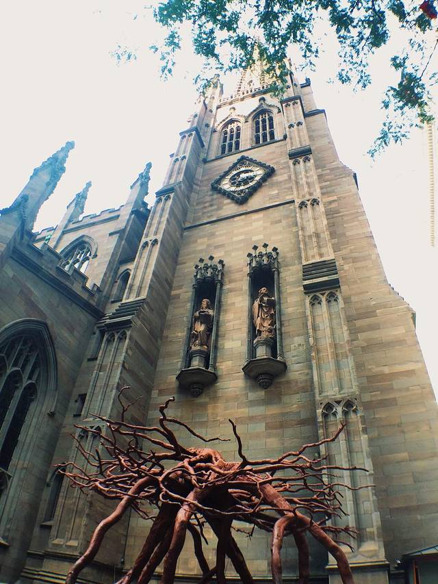 三一教堂有名的大红树杈子,铜质的。