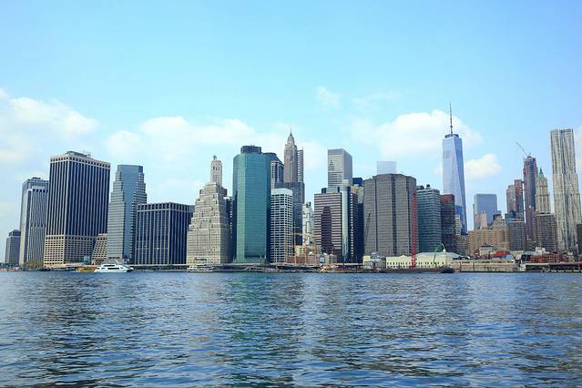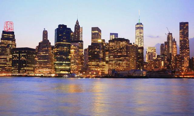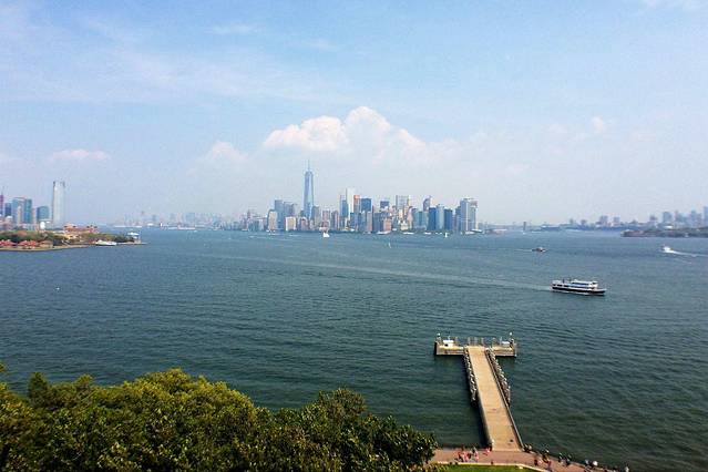 从女神岛上可以看到左侧的新泽西,中间的曼哈顿和右侧的布鲁克林。