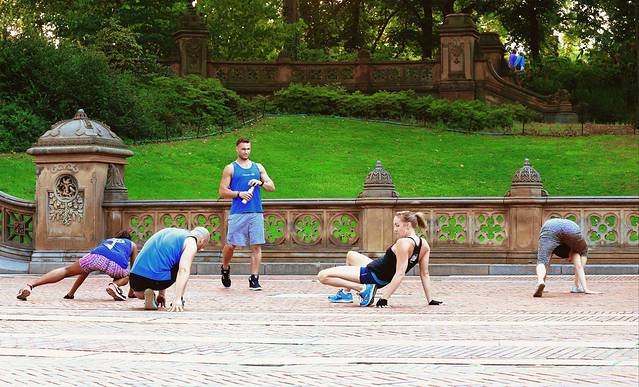 公园里锻炼的人很多。站着的那个是教练,其他是学生~